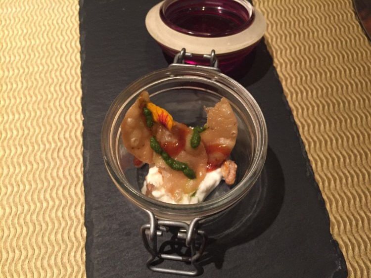 We all started with a drink of beer or a gin & tonic while we looked at the menu, not that we needed the time. It was a pretty quick decision on the non-veg chef’s tasting menu with the wine pairing. I went with the scallops over the chicken main, everything else was set.
