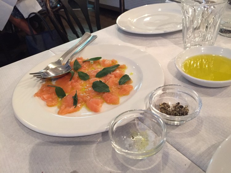 The wait staff kindly took all our coats and bags to be hung in a coat room and promptly brought us some bread, olive oil, salt and pepper of which I ate one too many probably. (Never put bread in front of me, I always will eat it all…)