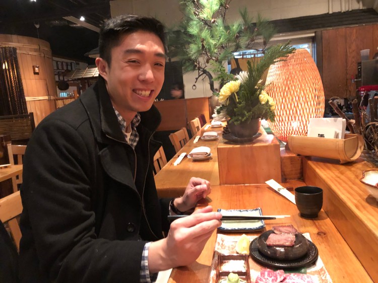 We started off with a seasonal special – Miyazaki beef, which is actually considered higher quality beef than Kobe, so my boyfriend couldn’t resist and had to order some (look how happy he is!) And you know what, it was pretty darn amazing. Just look at that beautiful striations in the meat. On top of that we got the experience cooking it on a hot stone with some salt, wasabi and ponzu sauce for dipping.