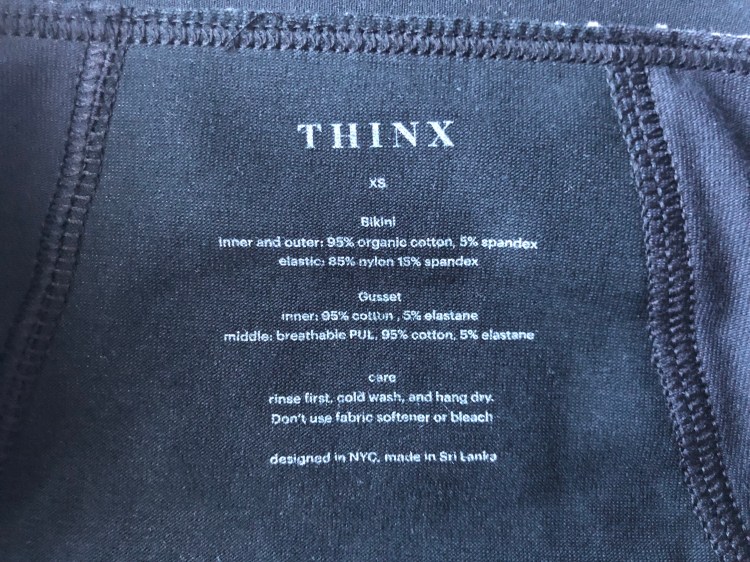 THINX offers 2 ranges of their underwear, original and cotton. The original line, as the name suggests, is their original collection of period underwear. All of these are made with a blended cotton interior and blended nylon exterior. Where as the cotton line, which was released later, has both a blended cotton interior and exterior. In both lines the ‘middle layer’ is made up of breathable PUL and a blended cotton. The PUL is a type of laminated fabric that is a waterproof layer and is what prevents leaking.