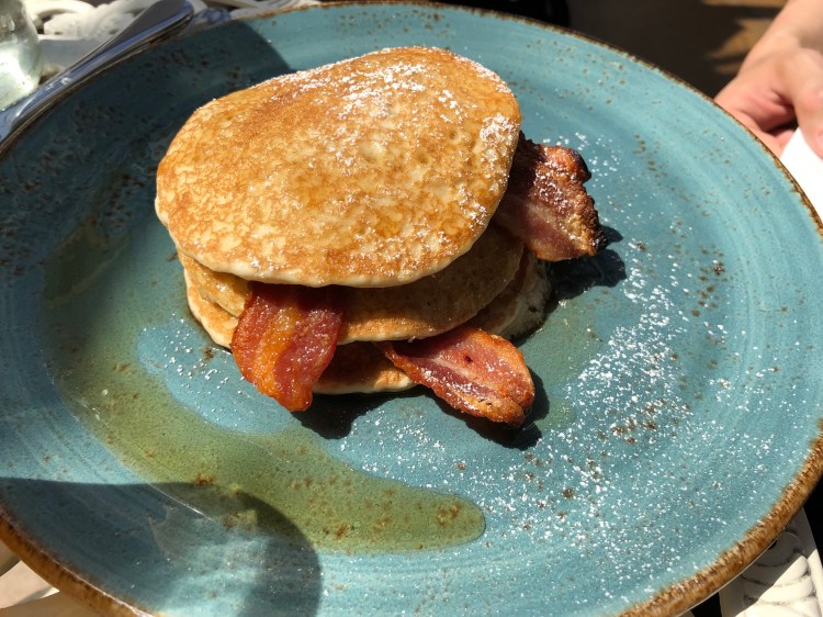 I am always a sucker for savoury food, but I also do love a good sweet breakfast, so its perfect when Chris orders the sweet and I get the savoury and we can share! We ended up ordering the pancakes with bacon, “The Scrumper,” and a side of has browns.