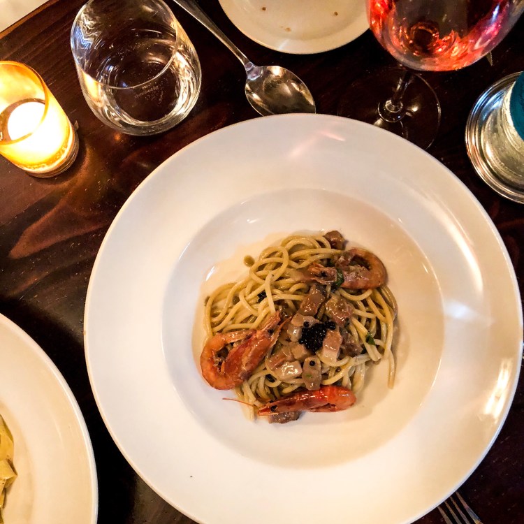 Starters – octopus with squid ink, boat pappardelle and truffle cream, and seafood spaghetti